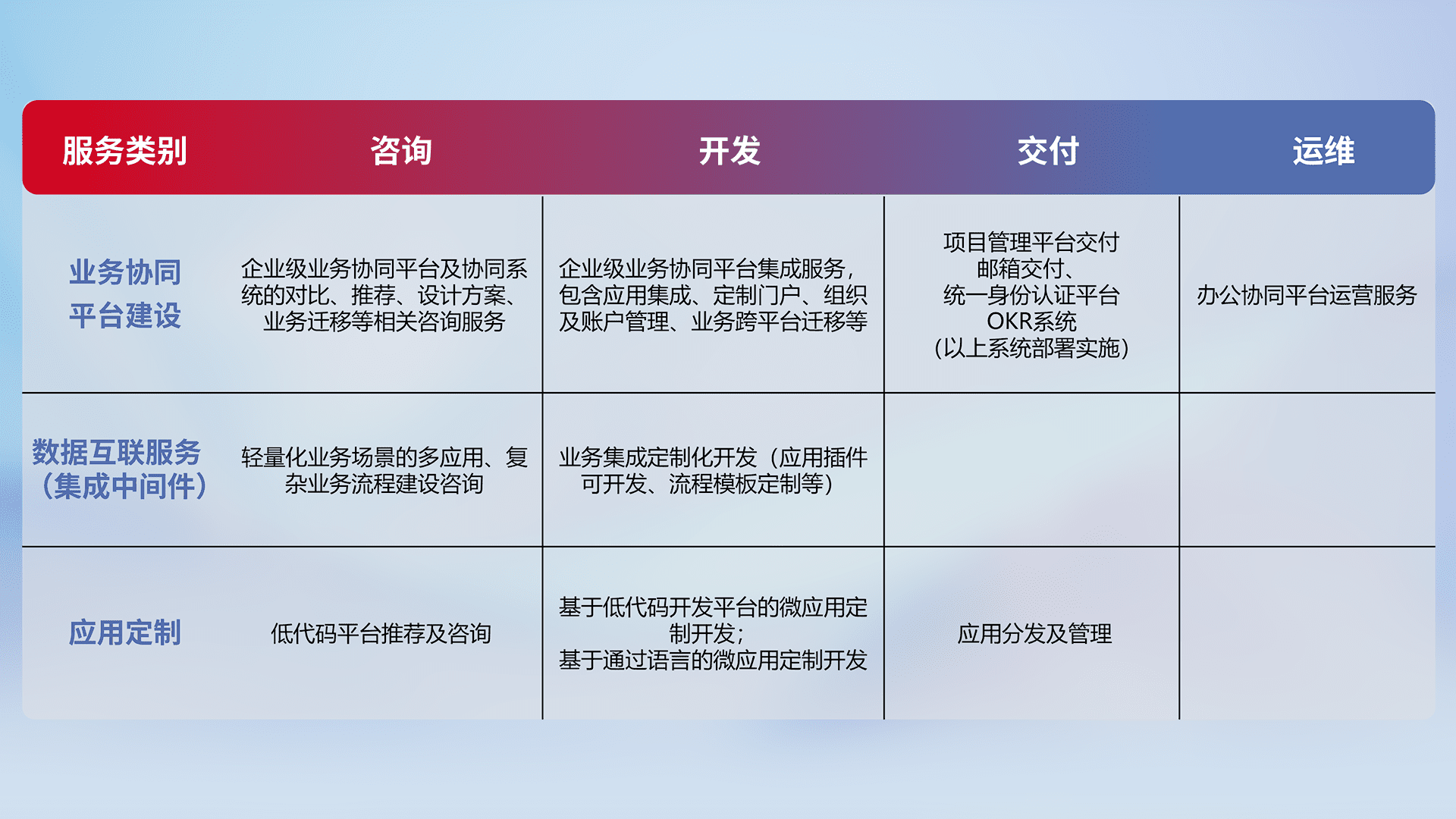 针对钉钉、、、企微、、、、IDaas等平台级产品提供产品的规划、、方案、、、交付、、、、定制化开发等服务,,,实现如统一协同办公、、、、智能客户服务、、、混合会议管理、、、智能数据查询、、、、等业务场景,,,实现数字化转型。。